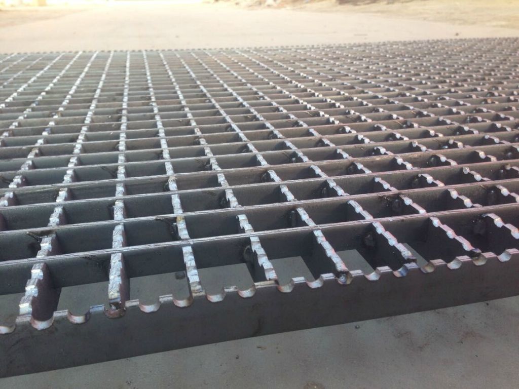防滑鋼格板由載重扁鋼和橫桿按一定間隔排列,用200t液壓電阻焊自動化設備焊接成原板,經鉆孔、切開、磨邊加工而成。
